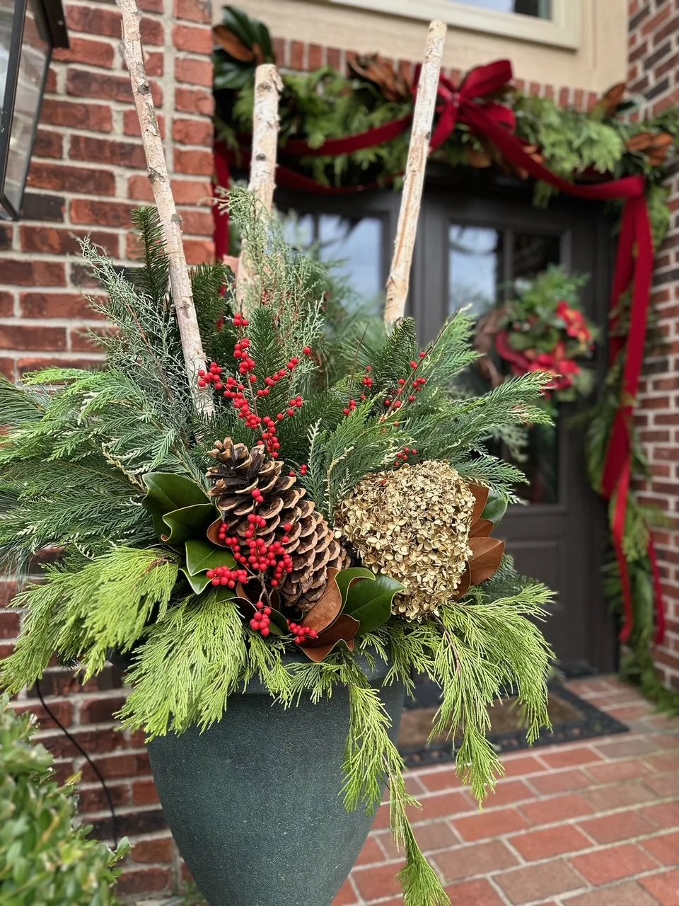 Holiday Pots - Fresh Wintergreen Mix with decor - for 2 pots (Up to 24”) - Fresh Cedar Garland Swag (20 Ft.)